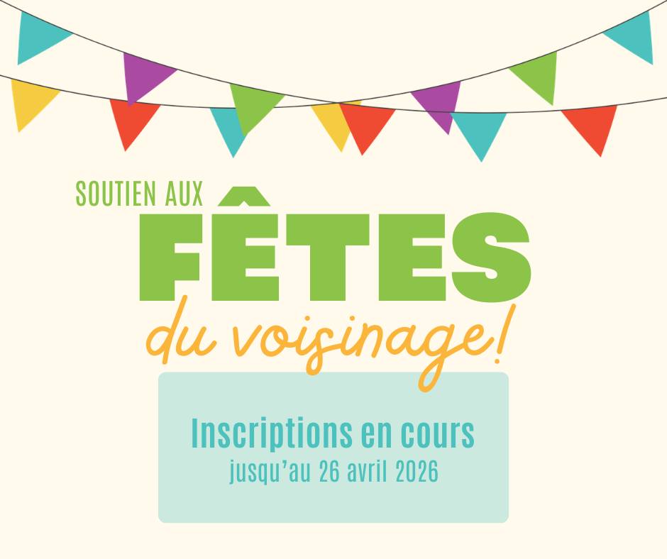 Fêtes du voisinage 𝗜𝗡𝗦𝗖𝗥𝗜𝗣𝗧𝗜𝗢𝗡𝗦 𝗘𝗡 𝗖𝗢𝗨𝗥𝗦 Envie d’animer votre quartier et de rassembler vos voisins? On est là pour vous donner un coup de pouce! Carte-cadeau d’épicerie Cartons d’invitation et affiches officielles Jeux d’extérieur originaux Trousse remplie d’idées pratiques Accompagnement à chaque étape Faites votre demande avant le 26 avril 2026 Inscription